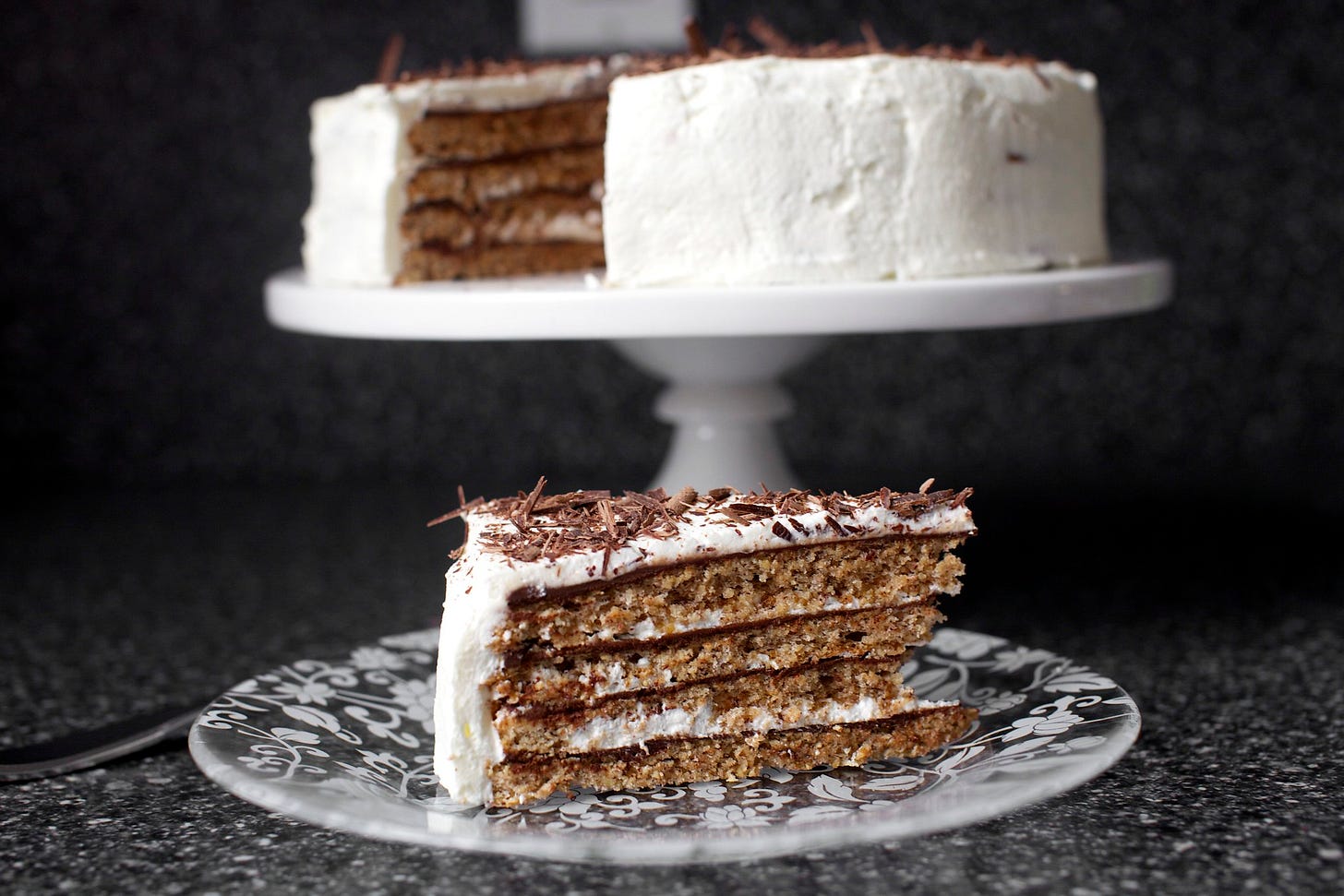 Did you know one of my favorite cakes I've ever made just happens to be flourless and kosher for Passover? Four layers of toasted hazelnut macaroon are slicked with just the right amount of bittersweet chocolate before softening into a cake-like state against barely-sweetened whipped cream. The result is rich but unheavy; a year-round favorite.