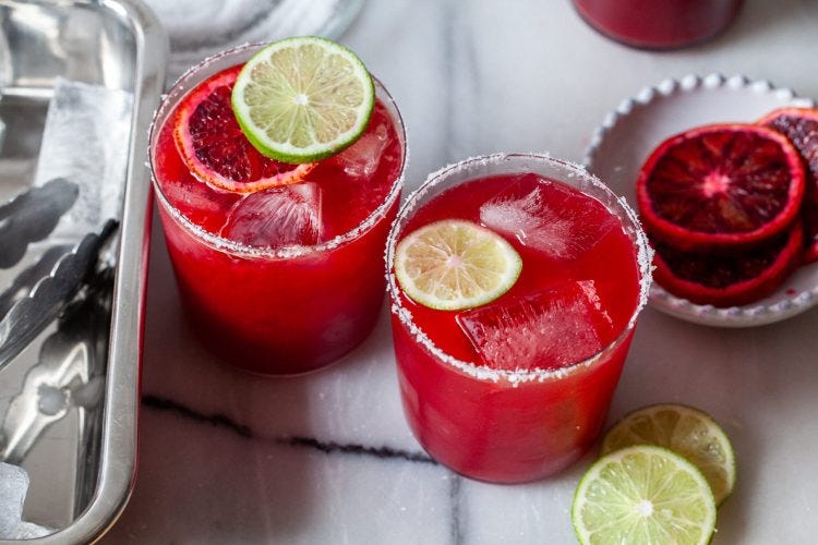 Does it seem like all of your so-called friends are on beachy vacations without you? Did you hear it’s going to be super cold again this weekend? I have just the elixir. It’s almost 5pm. I think we know what needs to be done. These margaritas got a glow-up last year after I got the most gorgeous blood oranges from Rincon Tropics.