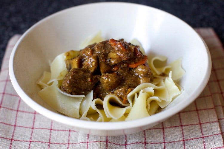 The best beef stew we’ve ever had. If you’ve thus far found beef stew kind of bland and uninteresting, if you’ve been tormented by thin broths, unevenly cooked vegetables, and tough meat, this is just the weekend luxury for you.