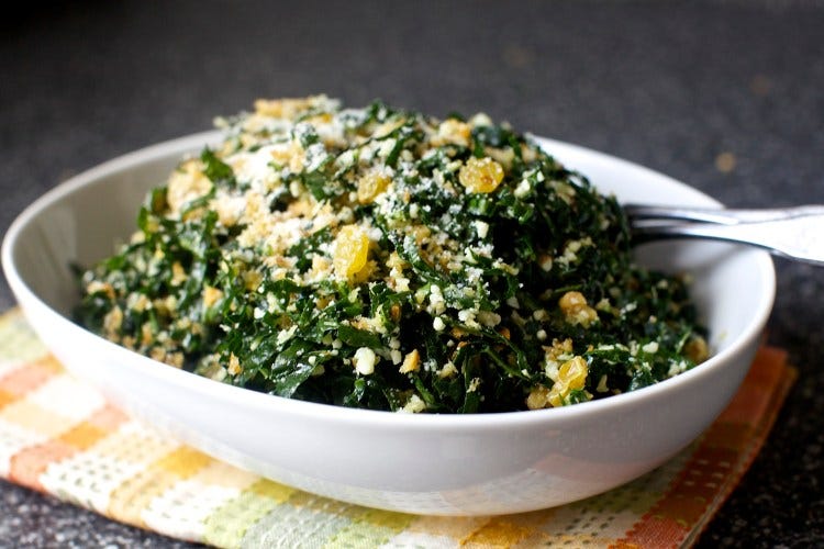 This is the kale salad that converted me, once a skeptic, to the dark green leafy side, and shortly thereafter, both of my kids. Cut into thin threads and tossed with vinegar-soaked golden raisins, sharp cheese, toasted walnuts and crispy breadcrumbs, we could eat a mile of this -- the perfect contrast to a decadent meal of fries, steak, and chocolate puddle cakes.