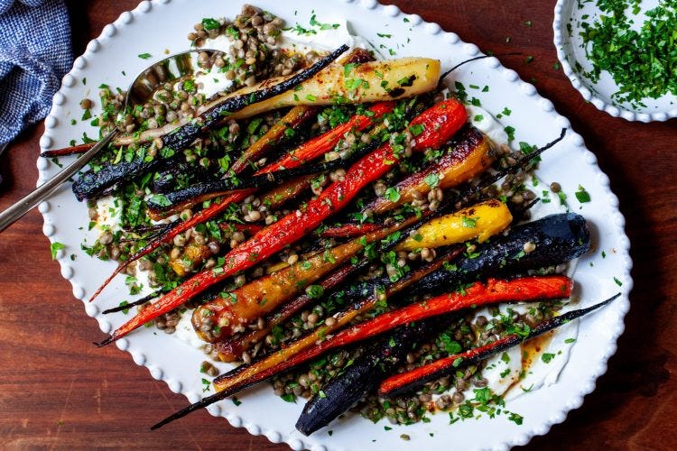 These carrots don’t just want to be a side dish. Roasted to perfection and layered over a lentil salad with a bright vinaigrette, a puddle of yogurt, and a fistful of herbs, the whole thing is so knife-and-fork delicious, serving size becomes an abstract concept.