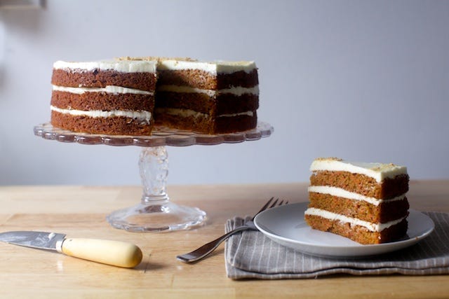 A moist, finely-layered carrot cake with warm spices and graham crumbs, stacked with all the cream cheese filling your heart desires. Needless to say, mine desires a lot.