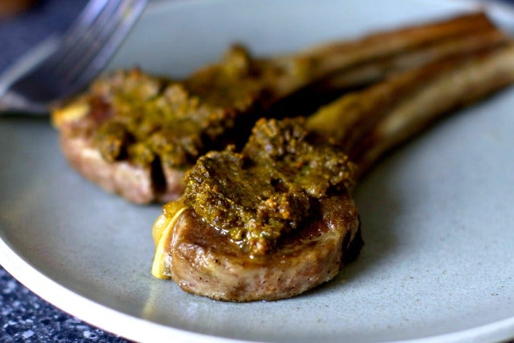 I love lamb chops more than any human being should and this is one of my favorite ways to prepare them, in which a paste of olives, pistachios, capers, garlic and herbs is smashed on mid-cooking and becomes one with the chops before they reach your plate -- it’s also one of the easiest. (Hooray.)