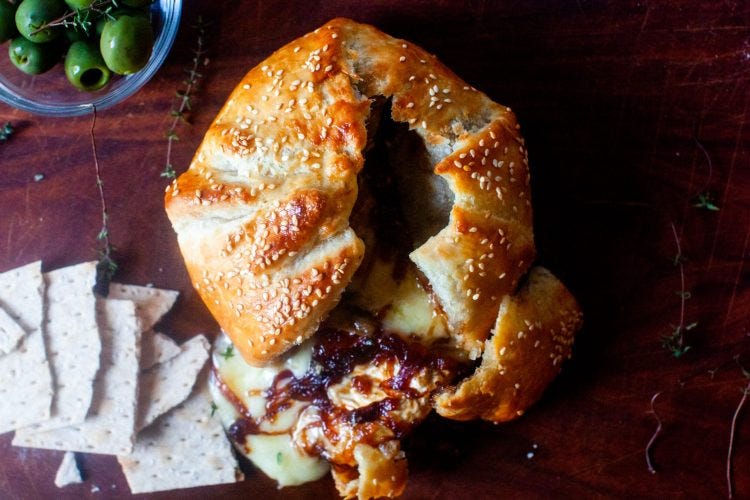 Baked brie, my way: A simple, flaky galette dough forms a decadent packet around a small wheel of brie with sweet-sour jammy red onions under and over the cheese, a paper-thin layer of Dijon, thyme, and a crackle of sesame seeds on top. There is nothing better.