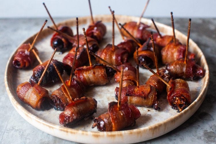 The most popular appetizer at every party is also the easiest to make. I am anti stuffing the dates (too fiddly, takes forever), but pro glazing, and this one with cider vinegar, maple syrup, flaky salt, and aleppo pepper makes what is already a delicious party snack exceptionally so.
