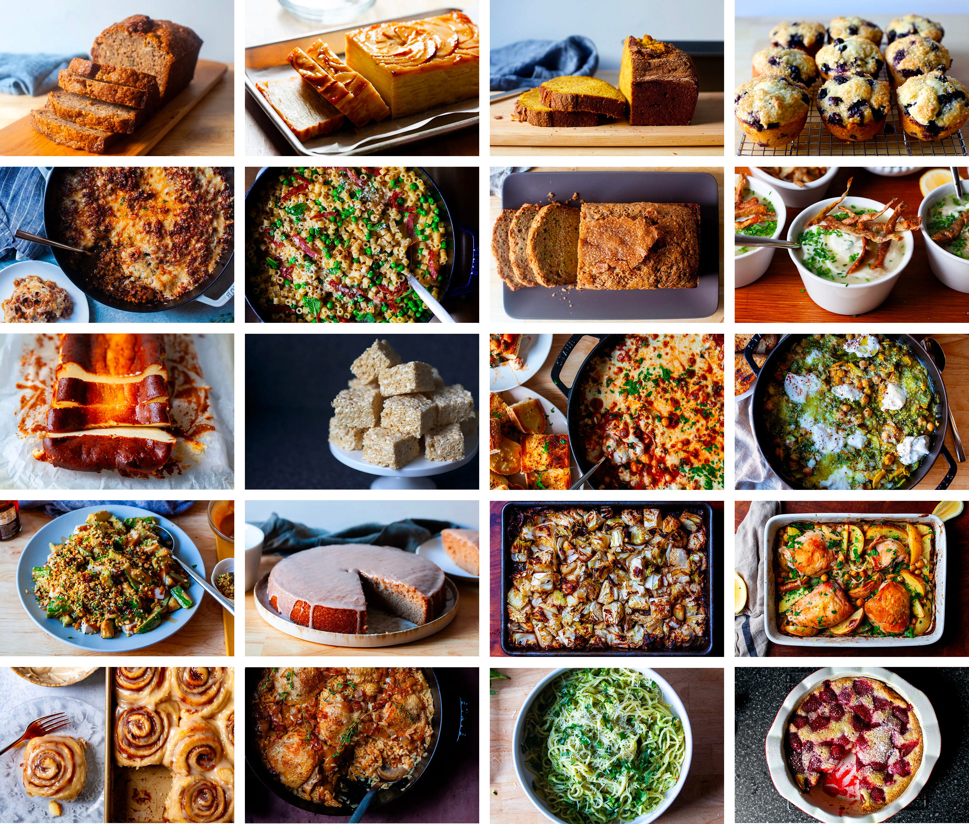 Ultimate Banana Bread, 2. Invisible Apple Cake, 3. Pumpkin Bread, 4. Perfect Blueberry Muffins, 5. French Onion Baked Lentils and Farro, 6. One Pan Ditalini and Peas, 7. Ultimate Zucchini Bread, 8. Potato Leek Soup, 9. Easy Basque Cheesecake, 10. Salted Brown Butter Rice Crispy Treats, 11. Ziti Chickpeas with Sausage and Kale, 12. Braised Chickpeas with Zucchini and Pesto, 13. Cucumber Crunch Salad with Tofu, 14. Glazed Apple Cider Doughnut Cake, 15. Charred Salt and Vinegar Cabbage, 16. Lemon Chicken with Potatoes and Chickpeas, 17. Easiest Cinnamon Rolls, 18. Chicken Rice with Buttered Onions, 19. Zucchini Butter Spaghetti, 20. Strawberry Summer Cake