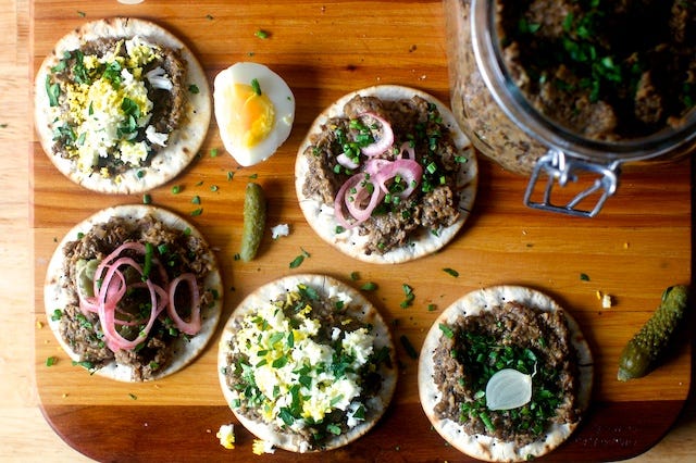 A hunt for vegetarian chopped liver led me to the land of earthy, luxe and flavorful mushroom spreads. But don’t get stuck on the word pâté, I find a jar of of this in the fridge useful in a dozen ways: tossed with angel hair pasta and parmesan, as a sandwich spread with greens and sharp cheese, and folded into a crepe or risotto, or as shown, on crackers or matzo with all sorts of bright fixings.