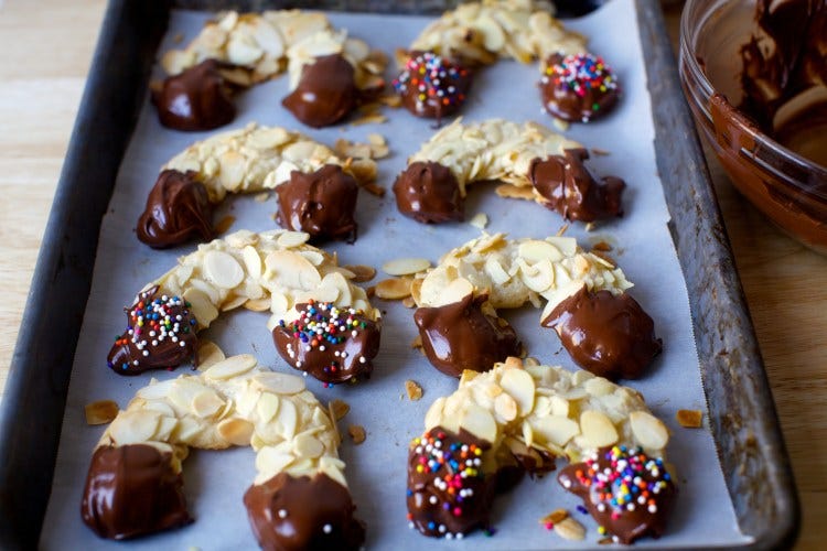 Chewy at the center with crunchy edges, naturally gluten-, flour- and dairy-free, these bakery-favorite almond horn cookies are shockingly easy to make at home and while I have yet to see them also with rainbow sprinkles, I say there’s no time like the present to make this a Thing.
