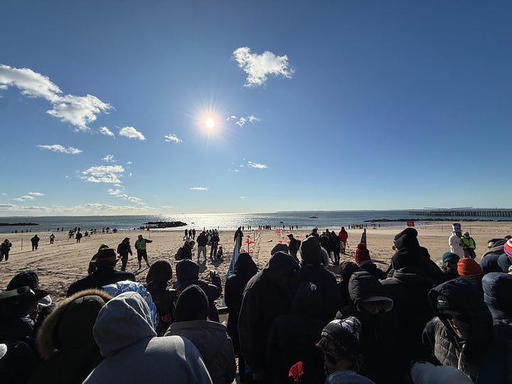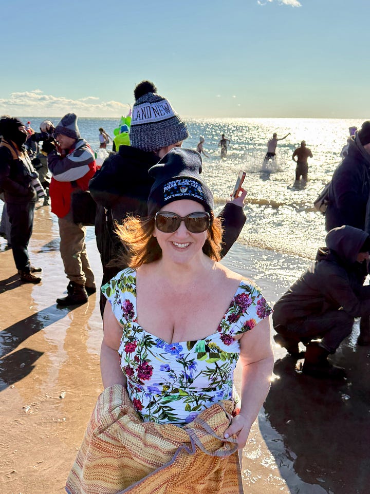 The Coney Island Polar Bear New Years Day Plunge. When I first moved to NYC, I read about this and thought “wait, that sounds fun.” I asked my roommate if he wanted to go and he said “absolutely not.” Over the years, this has been a consistent theme among friends, spouses, and family members I’ve asked. “Are you out of your mind, Deb?” “No, I don’t have hypothermia on my to-do list” and 25 years later I realized if I wanted to do it, I was just going to have to do it solo, which is what led me to running across a thin layer of icy snow (of course it had to snow) into the Atlantic Ocean at 11:05 am on New Years Day. “What is wrong with you, Deb?” has been a common question lobbed in my direction in the days since, and for this, I think I finally have an answer, which is that the overlap in the Venn diagram of “widely understood to be a bad idea” and “but how can I be absolutely sure if I haven’t personally verified this” is, unfortunately, quite large for me. It’s also where most of my ridiculous choices live, such as making friends celebrate my birthday at the Times Square Margaritaville two years ago, dragging my husband on a Kukoo Kunuku bus tour in Aruba a decade or so ago, and, well, this. Except for the part where I regret any of them, which I do not. I just laugh and check it off the Life List.