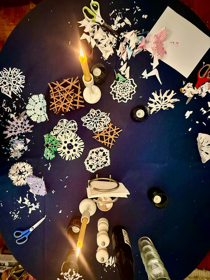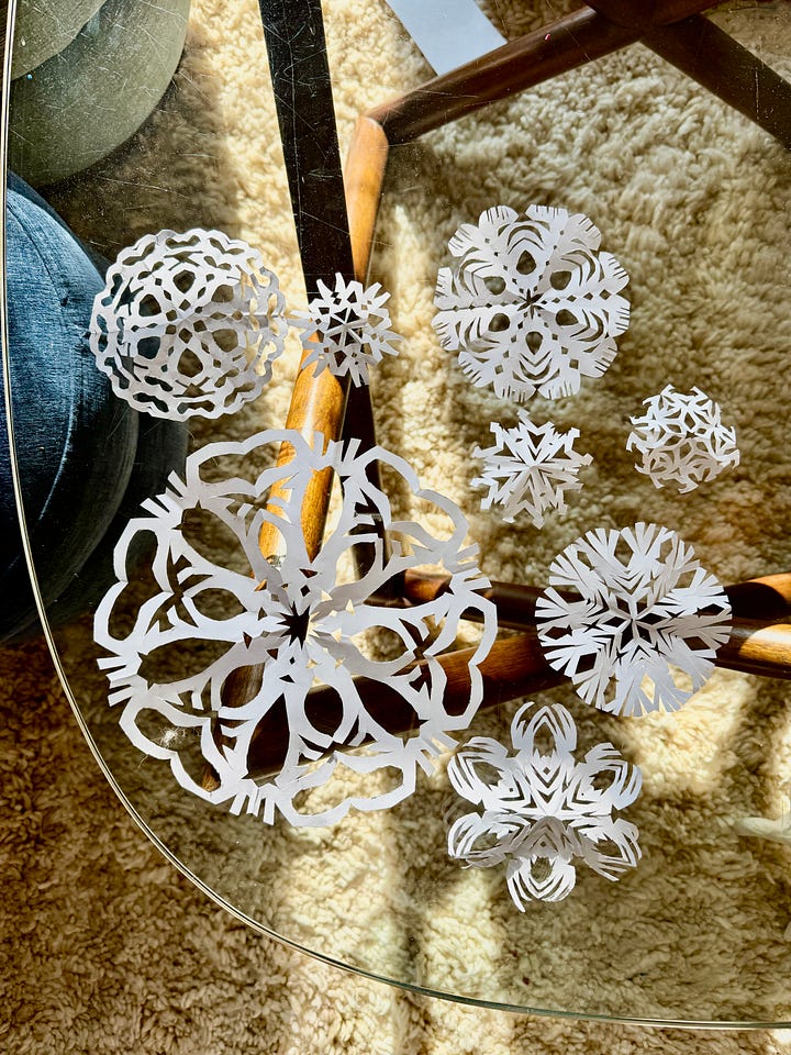 Snowflaking Hobbies? Interest? No, mostly my favorite thing to do over the December holidays (usually in those 10-minute intervals while waiting for trays of cookies to bake) is this. I use basic printer paper, squared off and folded into one-sixths, basic office scissors, and just notch away until there’s barely tethered skeleton of paper left. A couple weeks into covering every surface of our apartment in snowflakes, Elf-style, we found a pack of white origami paper and it’s even cooler because it’s already square, making it easier to round off, and a little thinner, so it’s easier for little hands to cut through. I hear paper coffee filters work well too, but don’t keep them around. Truly, you need no special equipment to make them, which is why it’s a perfect-for-us craft. On Christmas Eve we had friends over until late and they asked for snowflake tutorials and we somehow had the most Hallmark Movie-level earnest scene going on around the table as everyone got into crafting over wine and brownies.